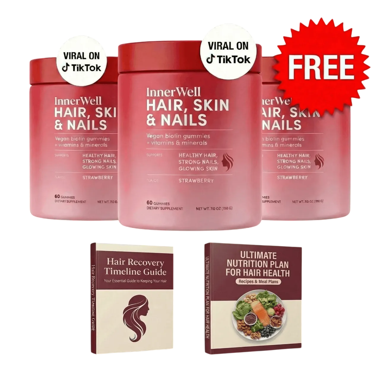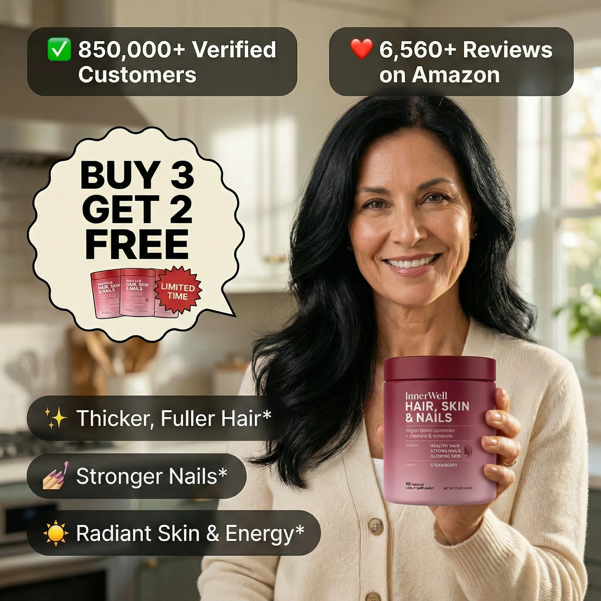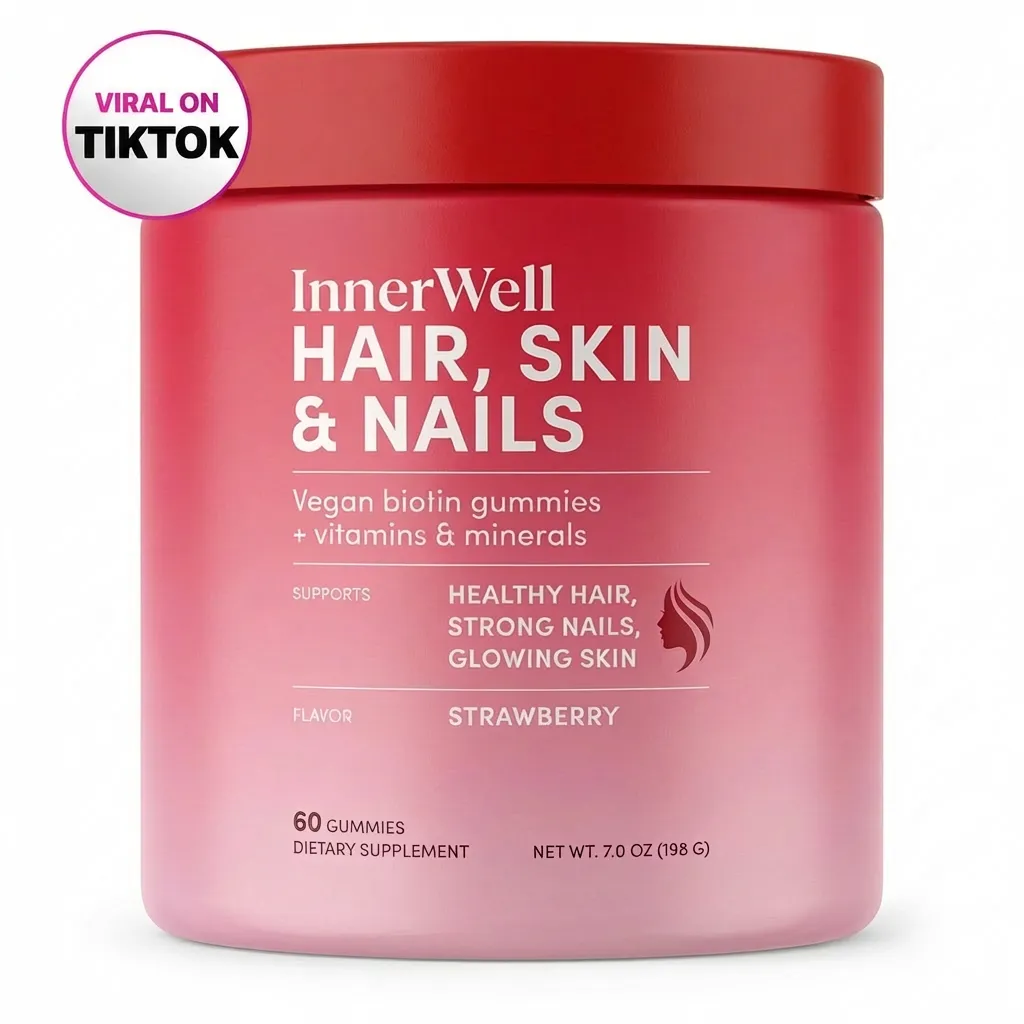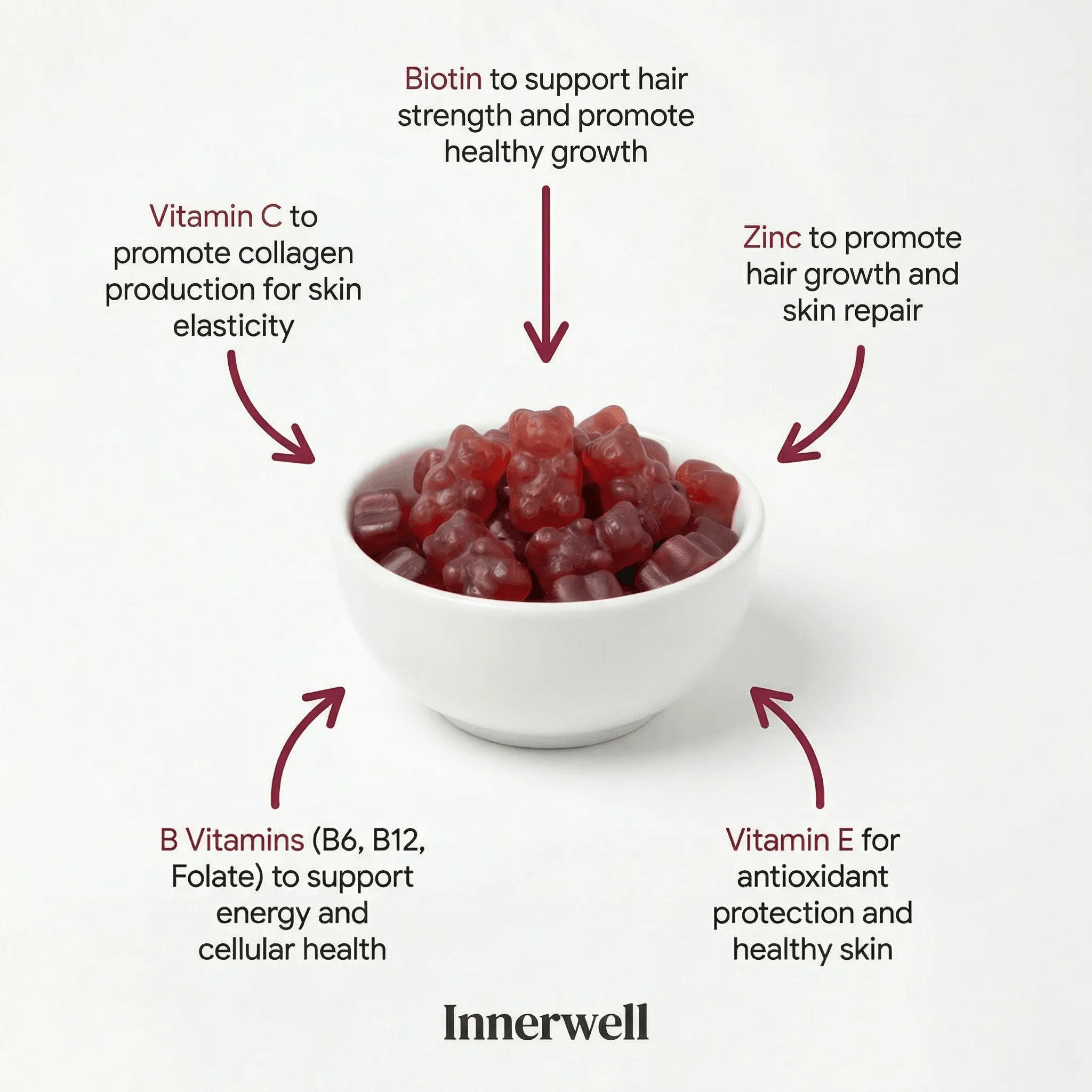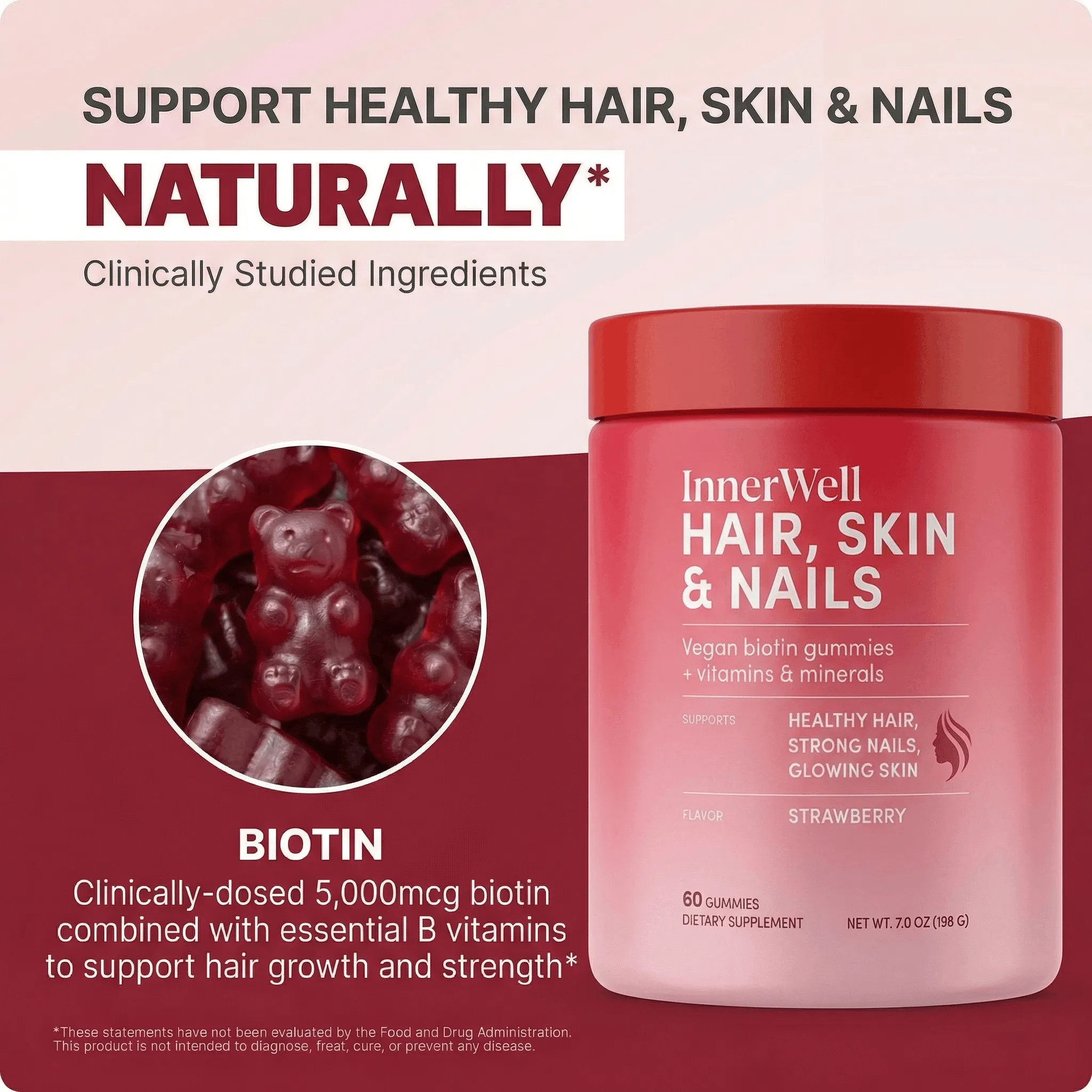InnerWell Hair, Skin & Nails Gummies deliver clinical-dose biotin (5,000mcg), essential B-vitamins (B6, B9, B12), zinc, and vitamin E directly to your hair follicles. These nutrients work together to: