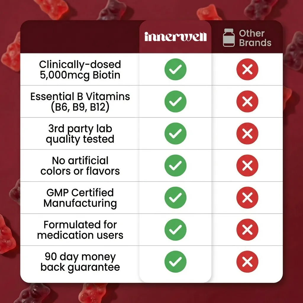 Clinical-Strength Formula Unlike drugstore brands with 300-500mcg of biotin, InnerWell contains 5,000mcg - the clinically-studied dose proven to support hair growth and reduce hair loss.