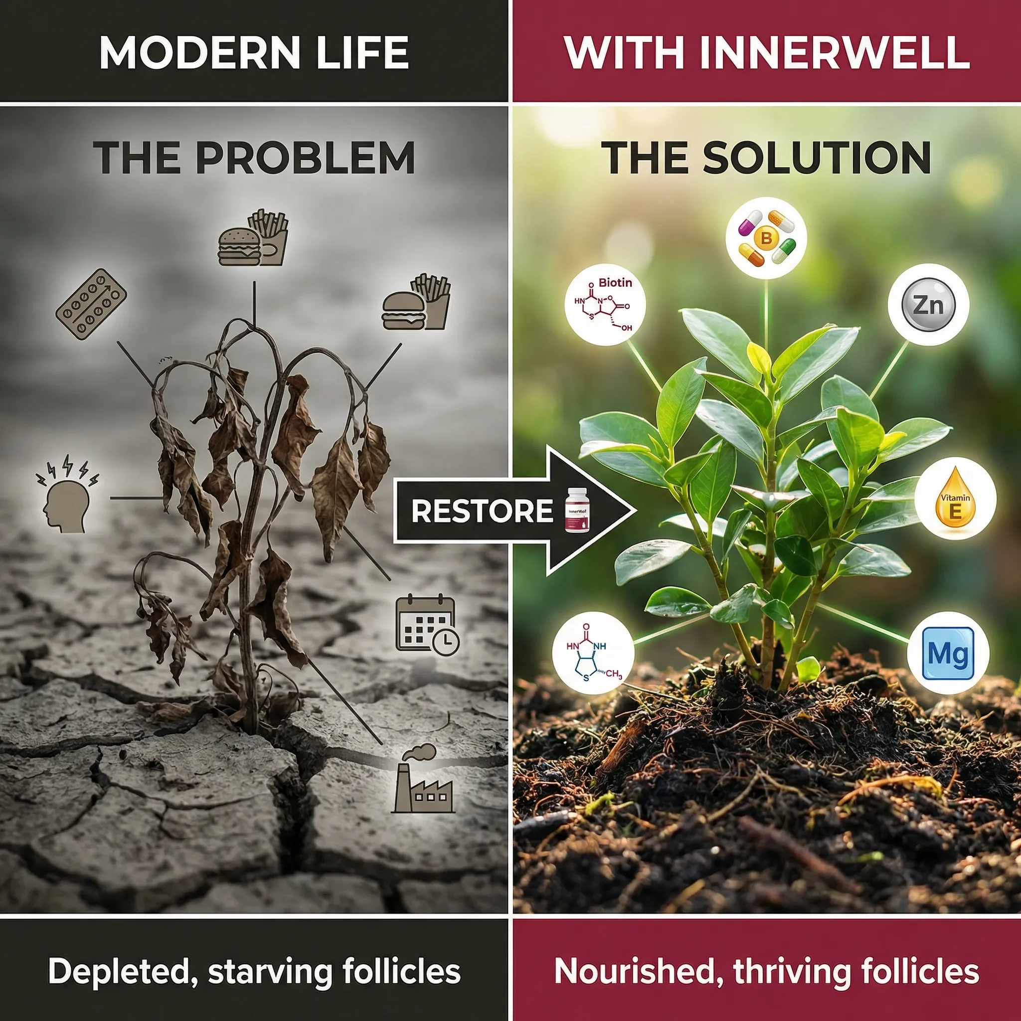InnerWell is designed to feed your follicles the complete nutrition they're desperately missing — the hidden root cause behind that clump of hair in your shower drain, that widening part line, and those brittle nails.