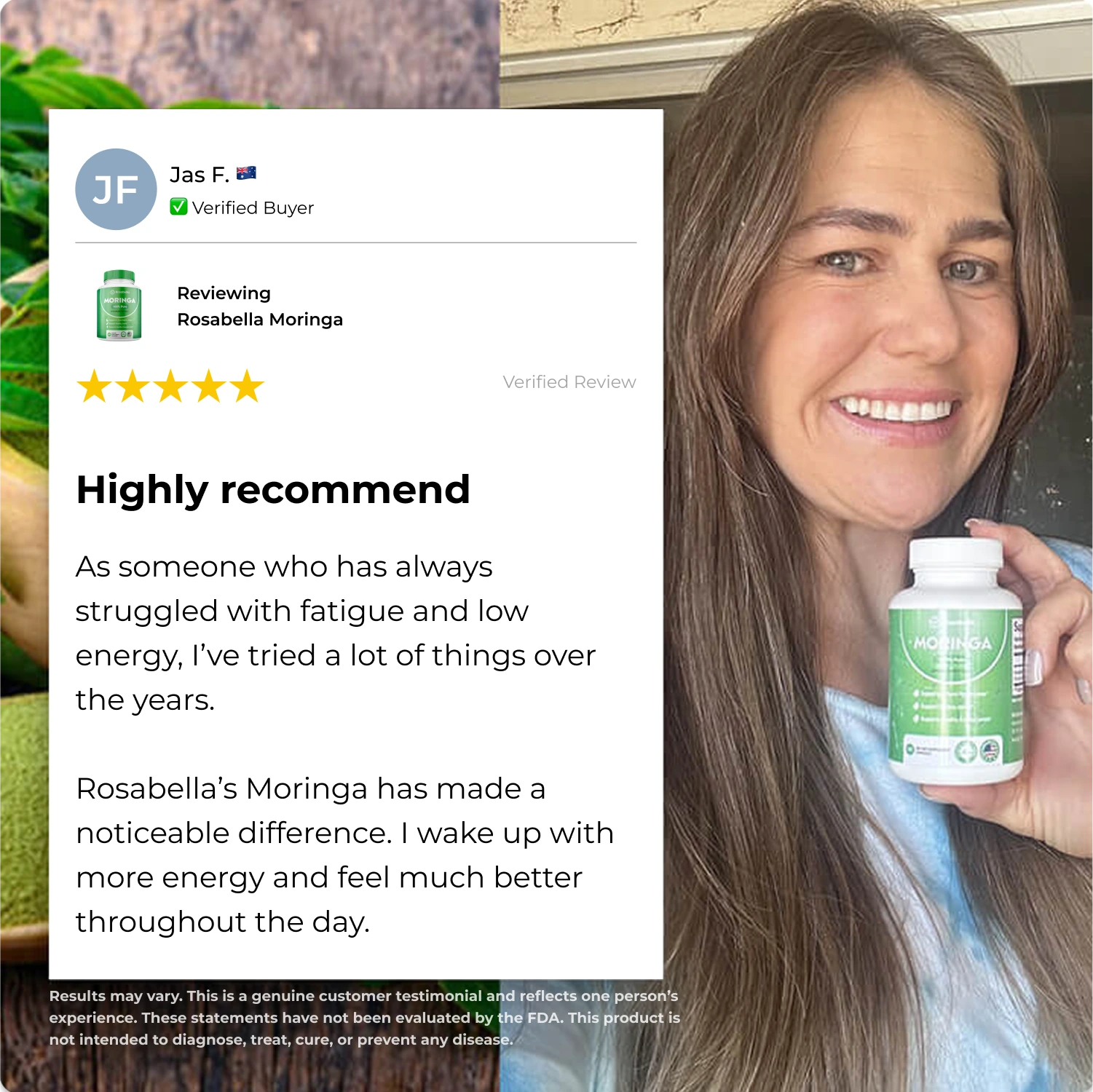 “I’ve been feeling lighter, more energized, and more focused since starting Rosabella Moringa. I love how it’s helping me feel more balanced overall.”
